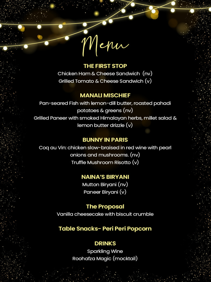 Indulge in a 5-course tasting menu inspired by Bunny and Naina’s unforgettable adventures - from mountain comfort food and homely warmth to playful global influences that mirror the movie’s zest for life. Each course is thoughtfully paired to complement key moments from the film, blending taste, travel, and emotion into one immersive experience.
