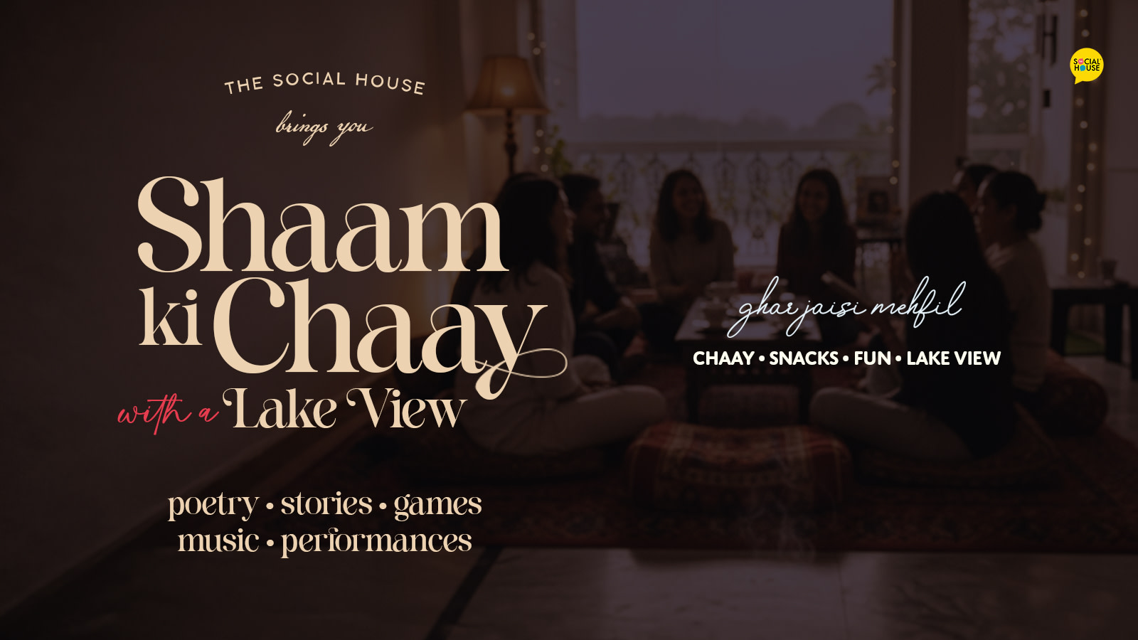 Shaam ki Chaay is a warm, house-style winter mehfil where you sit on soft dari flooring, sip hot chai, enjoy snacks, play fun games, and watch intimate live performances of poetry, stories, and music. A homely balcony evening overlooking the lake, filled with laughter, conversations and a calm winter breeze. If you simply want to relax, unwind, and enjoy an evening filled with good people, good vibes, and good art, this is your perfect shaam.