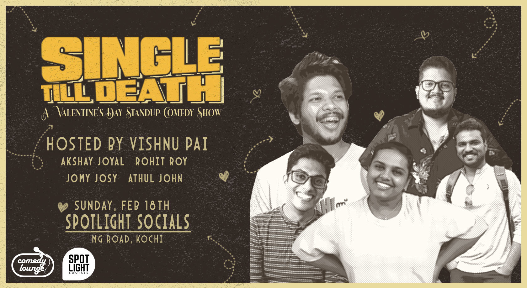 Love is in the air, but so is laughter! Don't miss Comedy Lounge's Valentine's Day stand-up comedy special, "Single Till Death" happening on Feb 18th at Spotlight Socials, MG Road, Kochi, starting at 7 PM. This hilarious night is hosted by the hilarious Vishnu Pai and features side-splitting performances by Akshay Joyal, Jomy Josy, Athul John, and Rohit Roy. Grab your posse and get ready for a night filled with comedy, camaraderie, and unforgettable moments.
