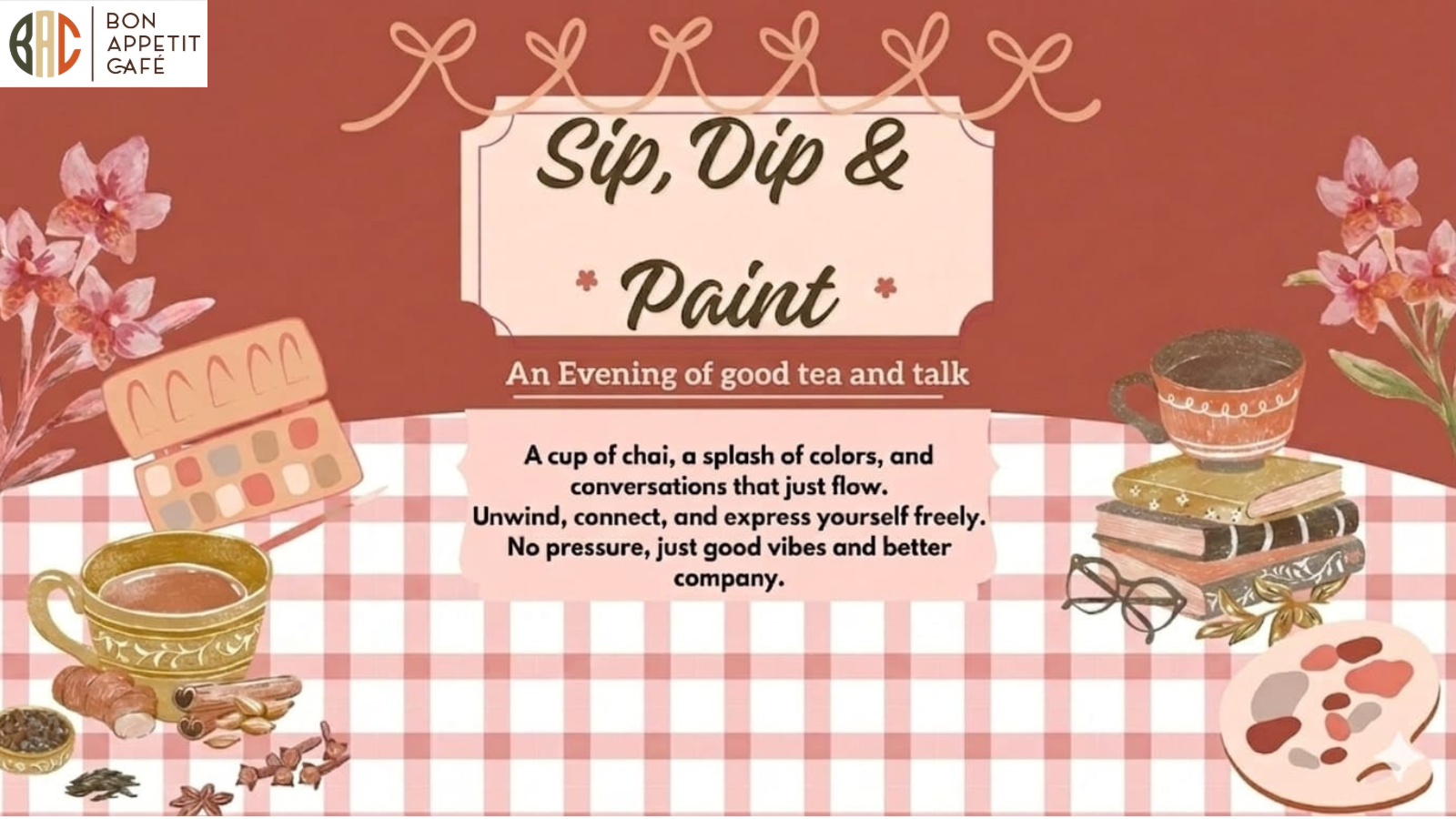 Join us at Bon Appétit for a cozy, chaotic, and creative evening where you paint, sip, and talk your heart out. 💬