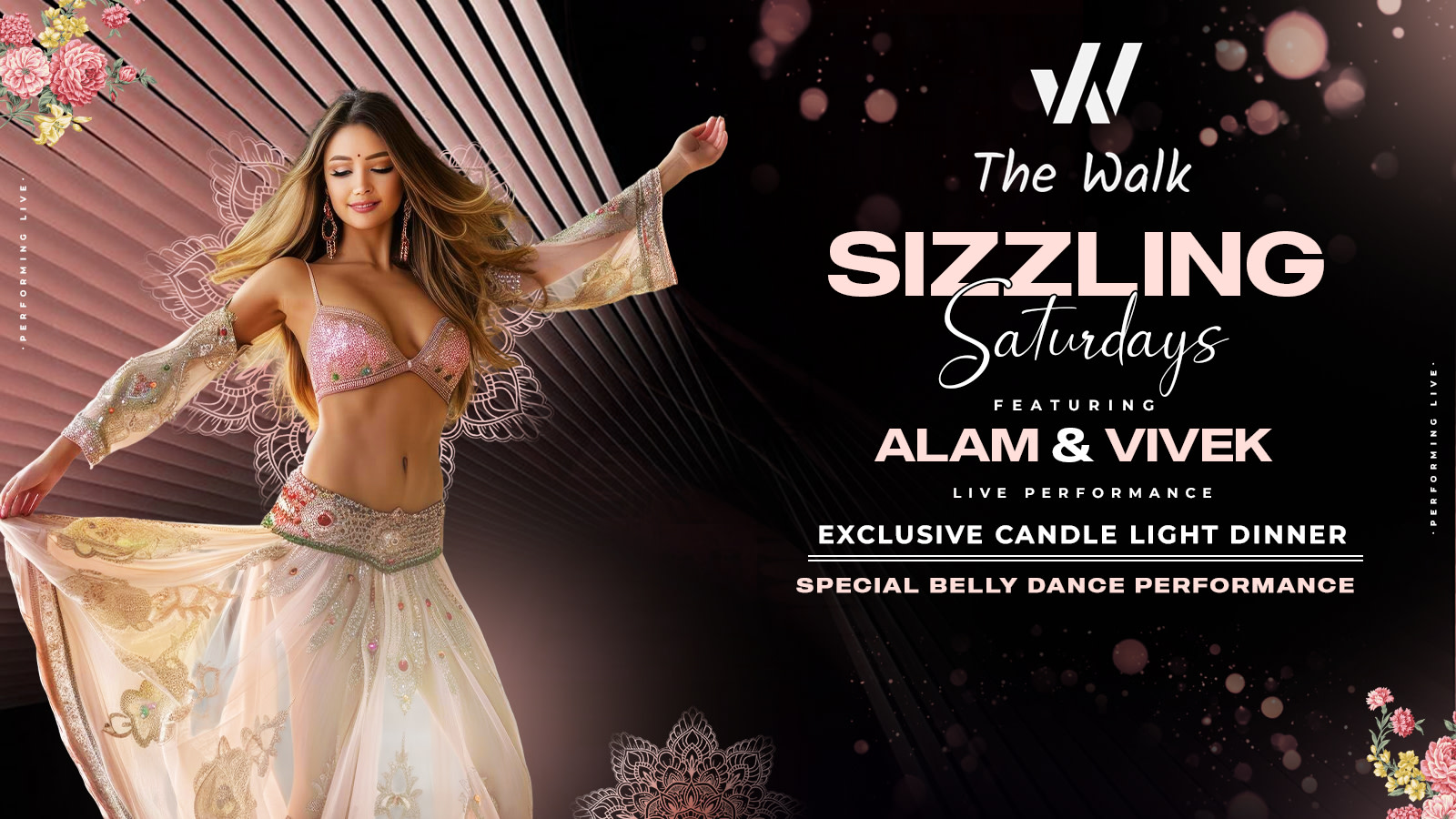 Arabian Dance Night features ALAM AND VIVEK, and live singing in a celebration that blends Bollywood roots with Arabic melodies .SHAHID will play keyboard, delivering Arabic fusion tunes; ALAM and VIVEK will drive the rhythm on the guitar, and Vivek will deliver powerful vocals over a mix of classic Arabic and contemporary dance tracks. The show showcases professional dancers, often international artists, performing belly dance and other captivating Arabian folk dances. Dancers, adorned in shimmering sequined costumes, move with graceful shimmies and fluid turns, right in the dining area or on a raised stage. A candlelit dinner adds to the intimate ambience. Join us for an immersive Arabian Night experience that blends melodic solos with rhythmic grooves and stunning dance performances in a warm, candlelit setting.