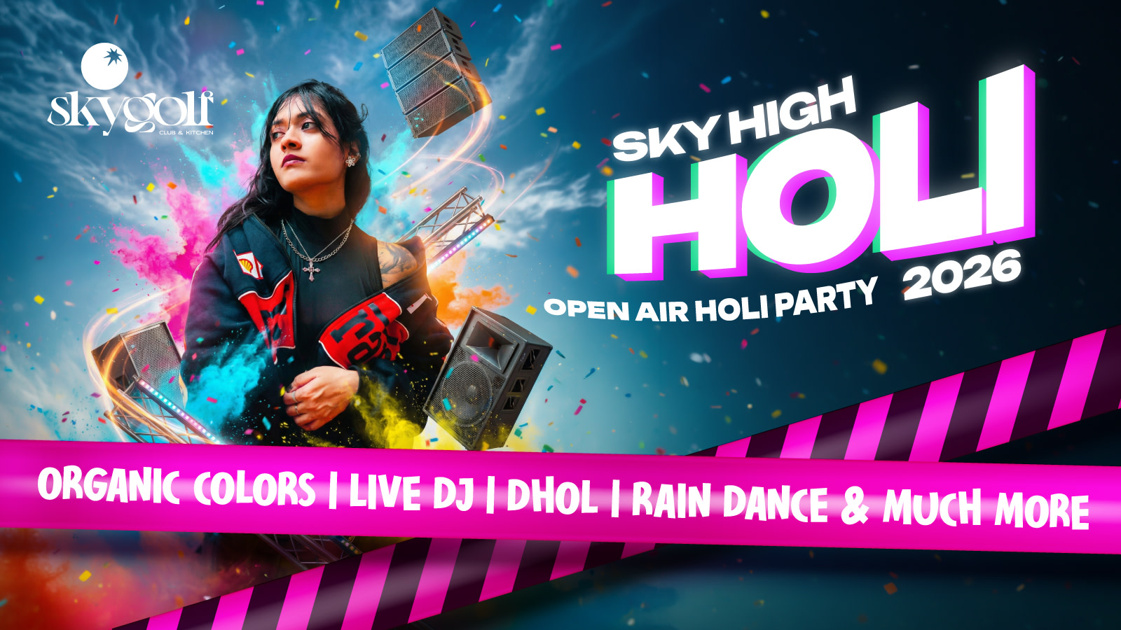 Celebrate Holi at one of the craziest Holi parties near Whitefield & Varthur at SKY Golf Kitchen & Club. Experience a high-energy open-air celebration with organic colors, rain dance, live dhol, and an electrifying DJ lineup including DJ Talam. Get ready for music, colors, and nonstop festival vibes at one of the most happening spots in the area.