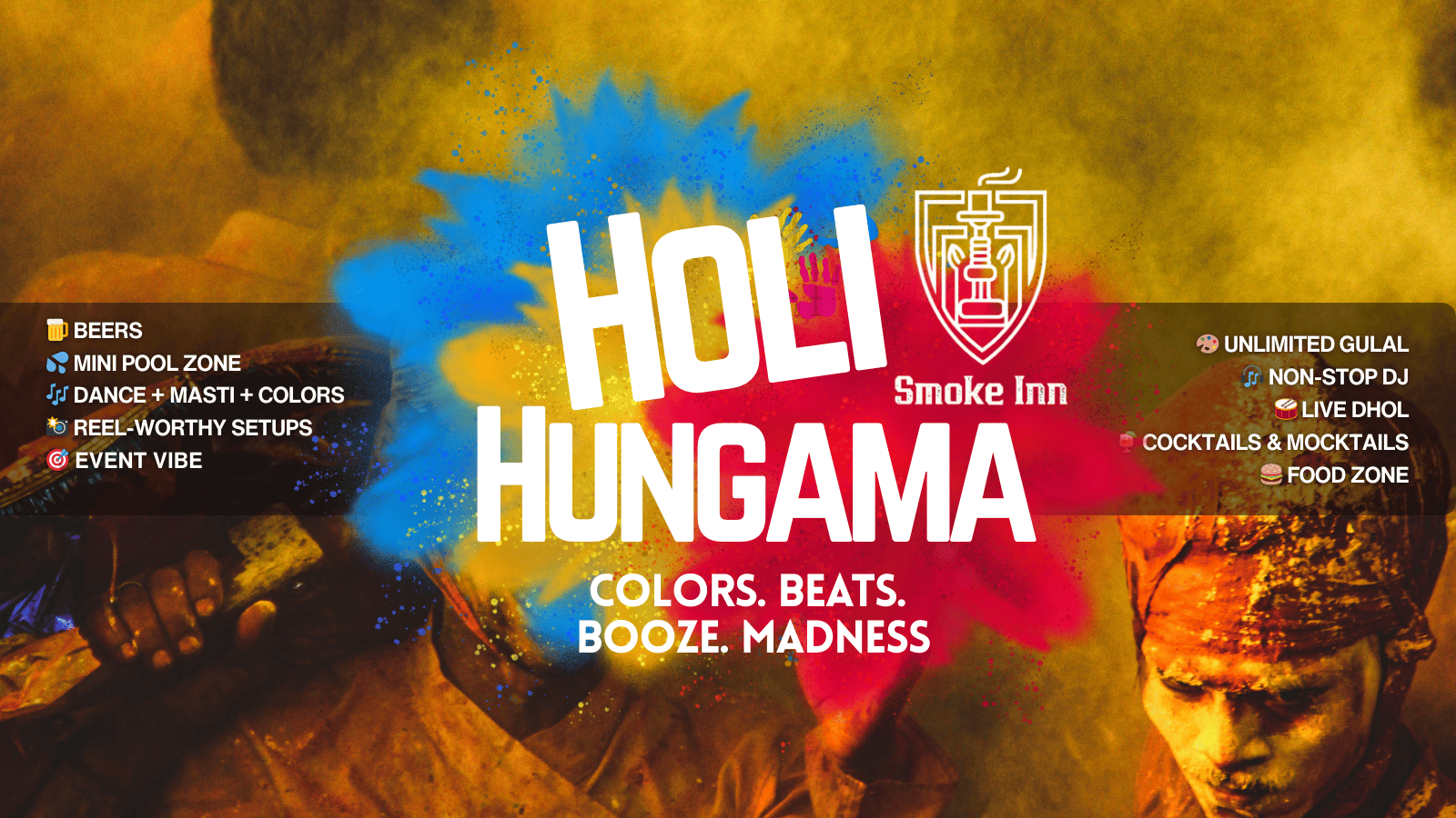 Celebrate Holi with unlimited fun, high-energy music, vibrant colours, and crazy vibes at Smoke Inn Cafe. From non-stop DJ beats to live dhol, from unlimited gulal to a mini pool party, this is where Jaipur comes alive in colours!