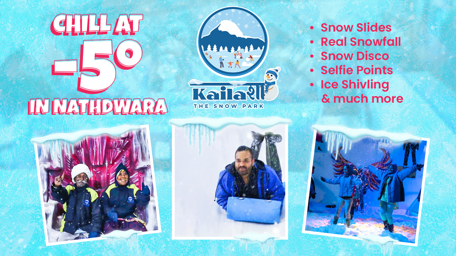 Escape to a winter wonderland at Kailasha – The Snow Park in Nathdwara, Rajasthan, part of the magnificent Statue of Belief complex, offering an unforgettable winter adventure perfect for families, thrill-seekers, and anyone seeking a unique escape where you can experience thrilling snow tobogganing, groove at the snow disco, witness live snowfall, explore a snow castle, and even build your own snowman. Beyond the snow, your visit also grants proximity to the awe-inspiring Statue of Belief (Vishwas Swaroopam), the world's tallest Shiva statue, featuring spectacular 3D projection mapping shows and thrilling adventure activities like bungee jumping, go-karting, and zip-lining, along with the unique Eyelusion 3D photo zone, a wax museum, VR games, carnival games, and a food court, making it a comprehensive destination open daily for continuous fun and excitement.