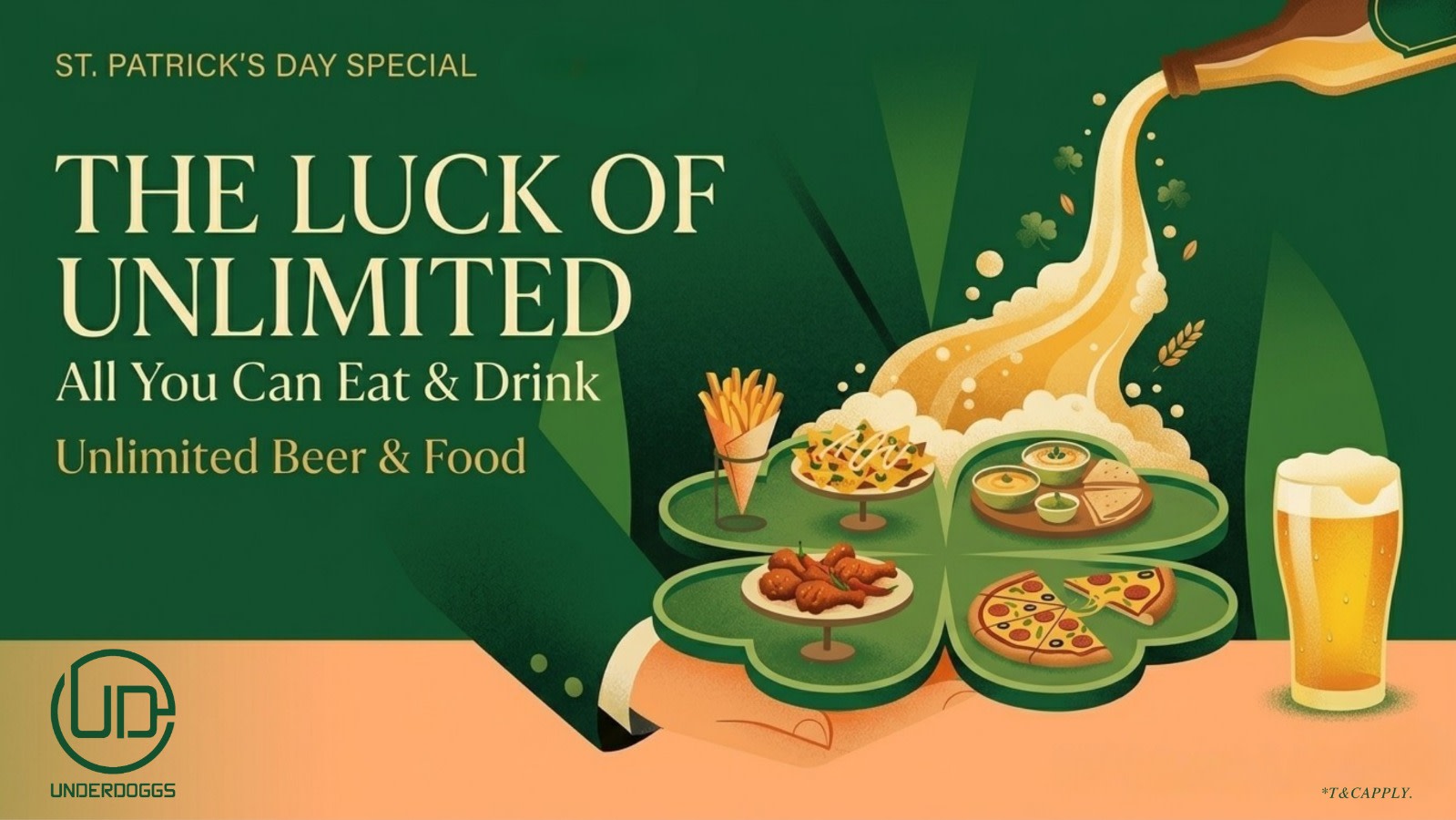 Celebrate St. Patrick’s Day at Underdoggs with The Luck of Unlimited — a festive experience featuring all-you-can-eat food and unlimited beer all day long.