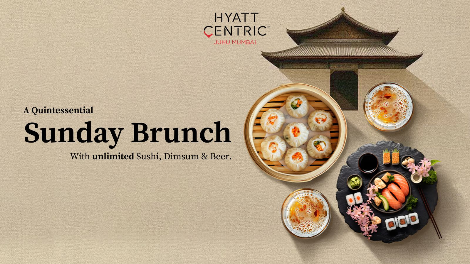Step into an elegant Asian brunch experience at Sesame, Hyatt Centric Juhu. Indulge in a thoughtfully curated spread featuring unlimited sushi and dimsum, fresh salads, comforting soups, and a live counter showcasing 10 signature dimsum & sushi creations.
