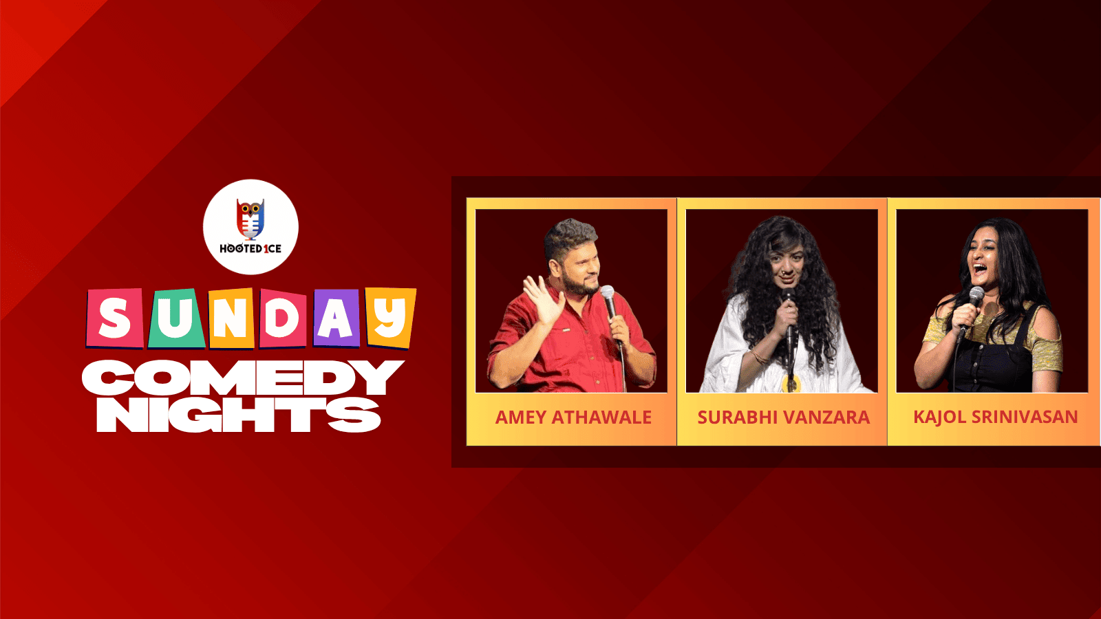"Unwind your week with laughter! Join us for Sunday Comedy Nights, featuring stand-up comedians Amey Athawale, Surabhi Vanzara and Kajol Srinivasan. Enjoy hilarious performances, great line up and good times with family and friends. Don`t miss out on the fun! Book your tickets now!"