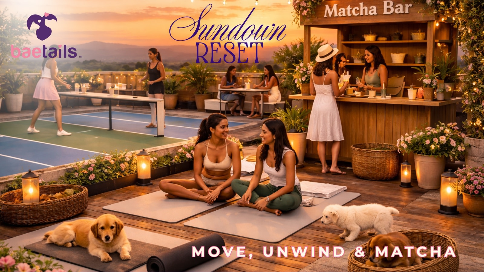 Start your evening with a guided pilates session on mats, unwind with Pilates with Puppies, and ease into a vibrant social setting with pickleball, curated games, music, and a matcha bar.