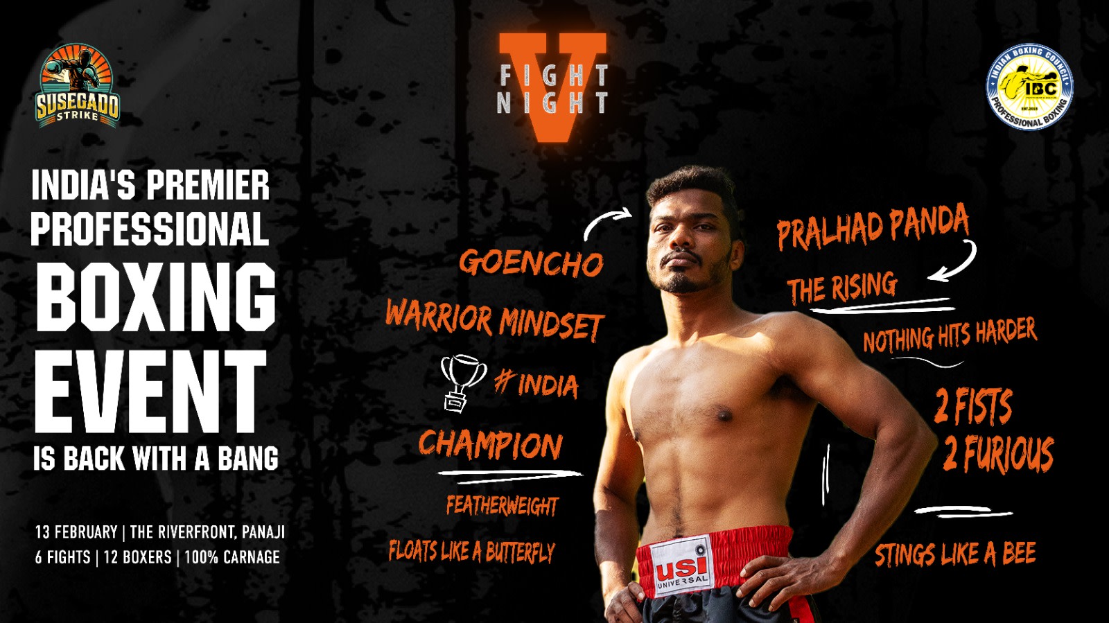 Susegado Strike returns with Fight Night 5 — a special Anniversary Edition set against the stunning Riverfront in Panaji, on the eve of Carnival. As the city readies itself for colour, music, and movement, Goa’s fiercest combat sports spectacle takes centre stage by the Mandovi, where the lights hit harder and the stakes feel higher.