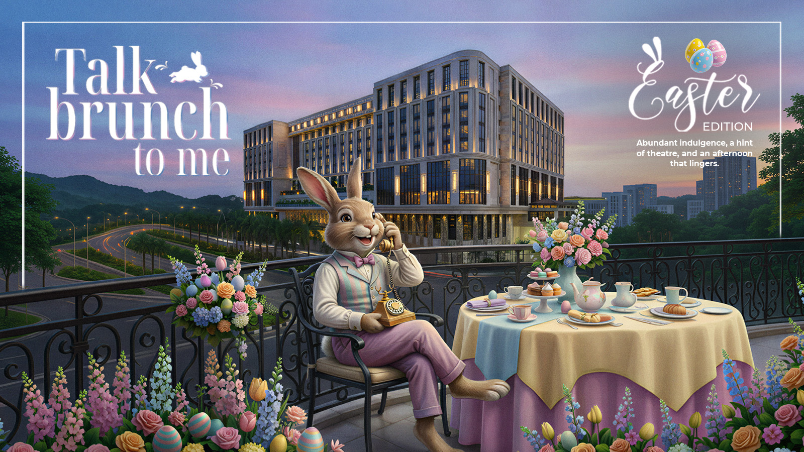 An enchanting Easter brunch comes alive in this elegant, storybook-inspired visual. Set against a sophisticated hotel backdrop at dusk, the scene blends indulgence with whimsy as a charming, well-dressed bunny hosts a delightful terrace brunch. Soft pastel hues, blooming florals, and delicately plated treats create a warm, inviting ambience, while the playful “Talk brunch to me” messaging adds a light-hearted, conversational tone. The composition beautifully balances luxury with festive cheer, positioning the experience as both indulgent and memorable. It promises guests an afternoon of refined dining, gentle theatre, and seasonal celebration—where every detail is thoughtfully curated to linger beyond the moment.