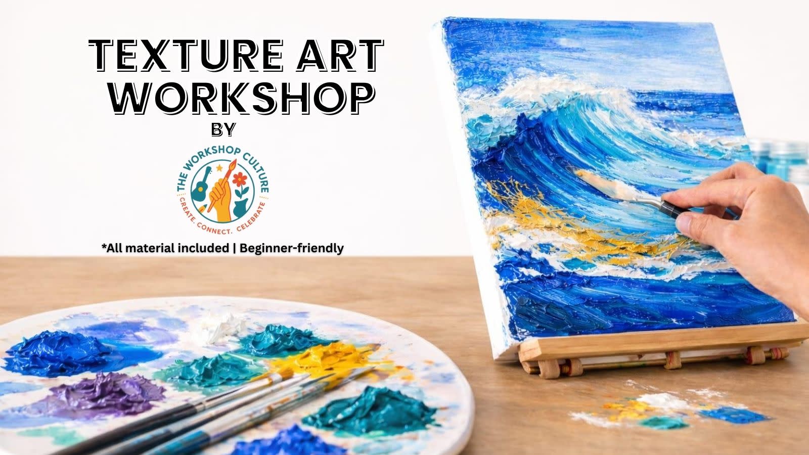 Step into a mindful, hands-on Texture Art Workshop by The Workshop Culture, where you’ll learn essential texture art techniques including layering, palette knife methods, and composition. Guided by a professional artist, you can choose from Ocean, Floral, or Abstract designs and create a stunning textured artwork from scratch—perfect for beginners and art lovers alike. No prior experience needed.