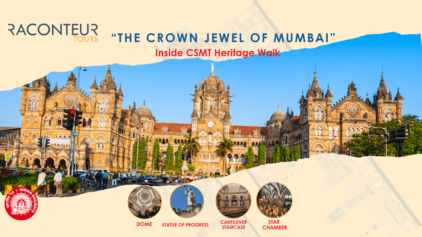 Welcome aboard our ‘Crown Jewel of Mumbai-Inside the CSMT Heritage Building’ walk tour. On this 1.5 hr long tour, take a step into the quiet solitude of the CSMT heritage building, a dramatic contrast from the ever bustling main road just outside. Walk through the passages and corridors of an architectural marvel which until now was a mystery to the commoners of Mumbai. Begin the tour at the heritage museum, overflowing with railway relics from the days gone by. Then walk into the front garden to marvel at the collection of architectural features that dot the building, each one bearing its own significance and story. We then move to the pièce de résistance of the tour, the Staircase and the Grand dome, architecturally speaking the one of the grandest designed structures in India. We finally end the tour in the gallery overlooking the star chamber, more commonly known as the local ticket counter, as we soak in the hustle bustle of the movement on the platforms.