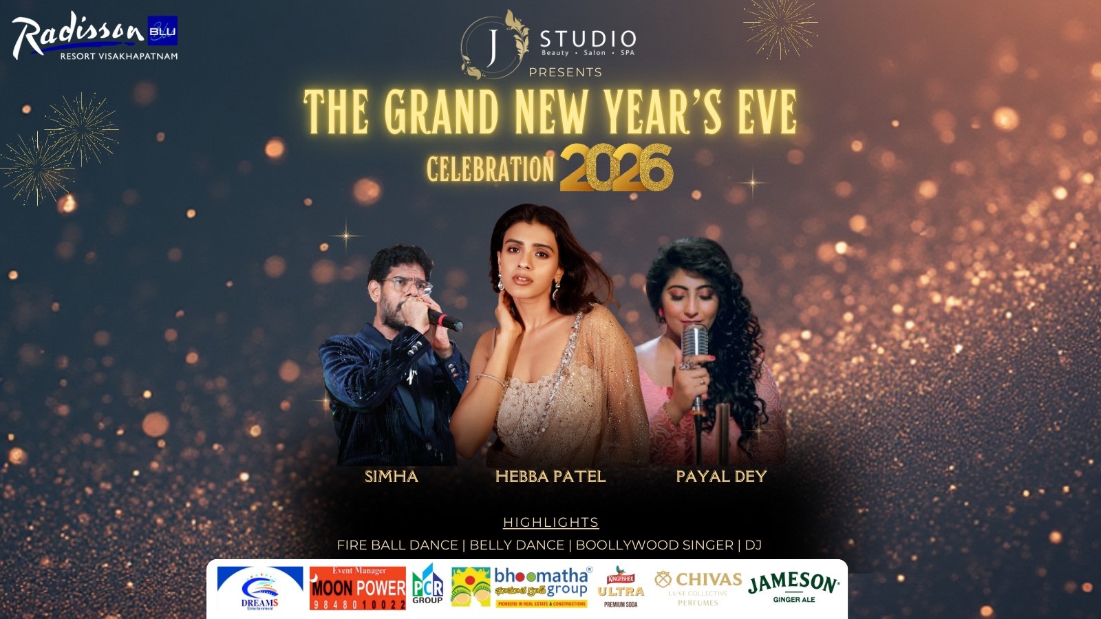 Welcome 2026 in grand style at Radisson Blu Resort, Visakhapatnam, with a power-packed night of premium entertainment. The celebration features a sensational live performance by Filmfare Award winner Simha, Bollywood singer Payel Dey, and a special appearance by Hebah Patel.