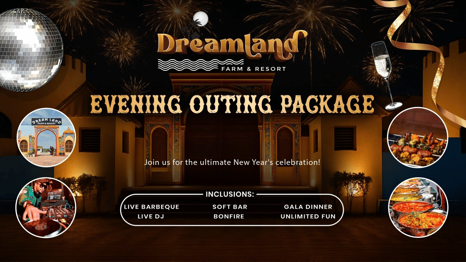The Evening Outing (7 PM - 1 AM) priced at ₹3,999/Couple (STAGS NOT ALLOWED) features a spectacular Gala Dinner, Live Barbeque, Soft Bar access, Bonfire and high-energy music from a Live DJ—guaranteeing Unlimited Fun.
