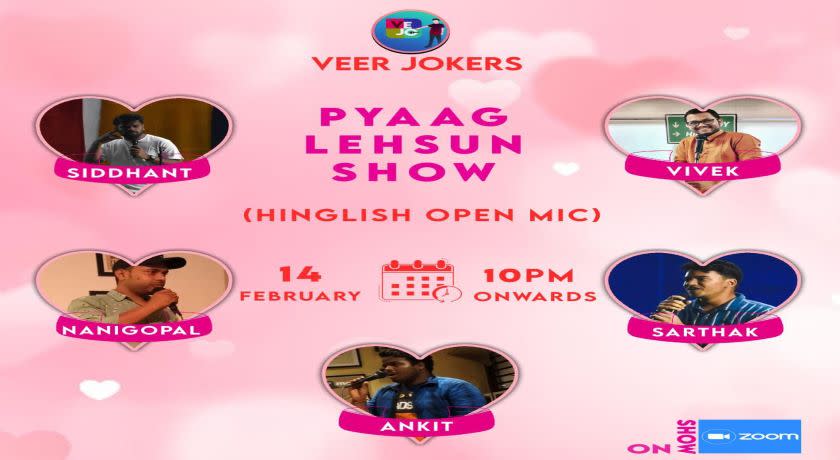 This Valentine's Day VEER JOKERS brings you "THE PYAAG LEHSUN SHOW", a Stand-up comedy open mic which will be hosted on ZOOM where you get a bunch of comedians tickle your funny bones with there jokes!!