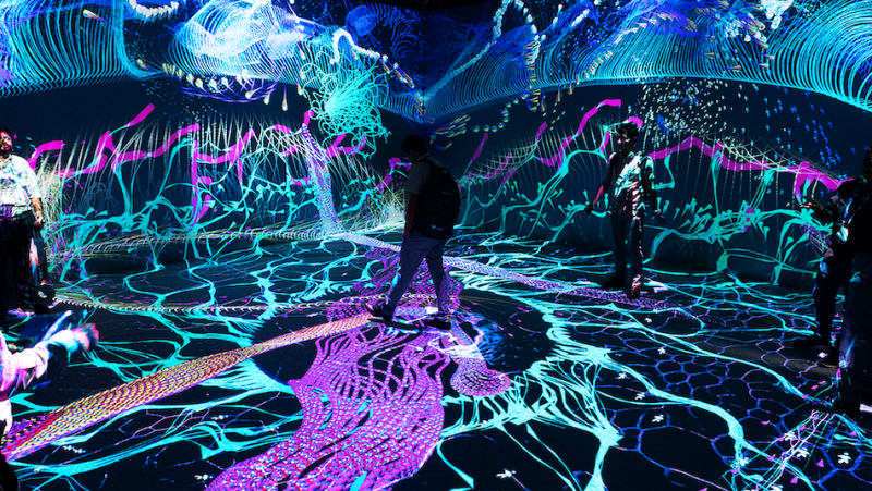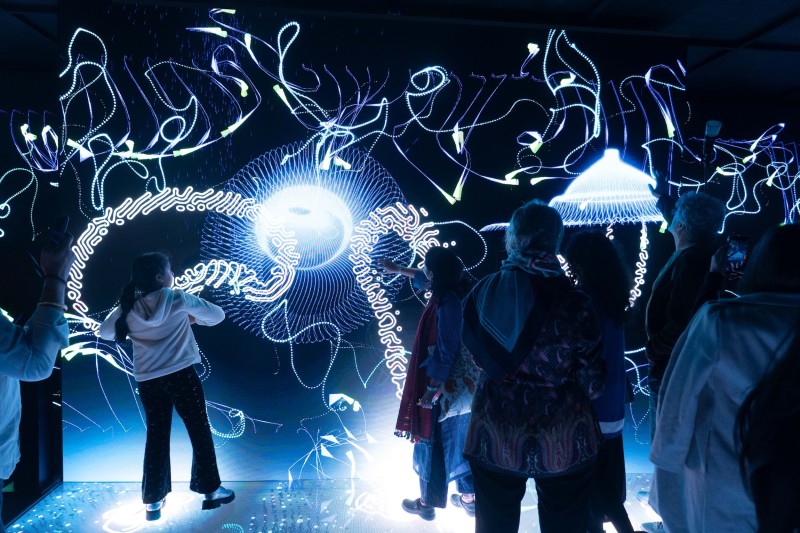Explore 15+ immersive art-tech installations spanning large-scale projections, interactive works, and experimental environments. A 360° immersive dome experience forms a central part of this pillar, presenting full-dome audiovisual works designed for complete spatial immersion.