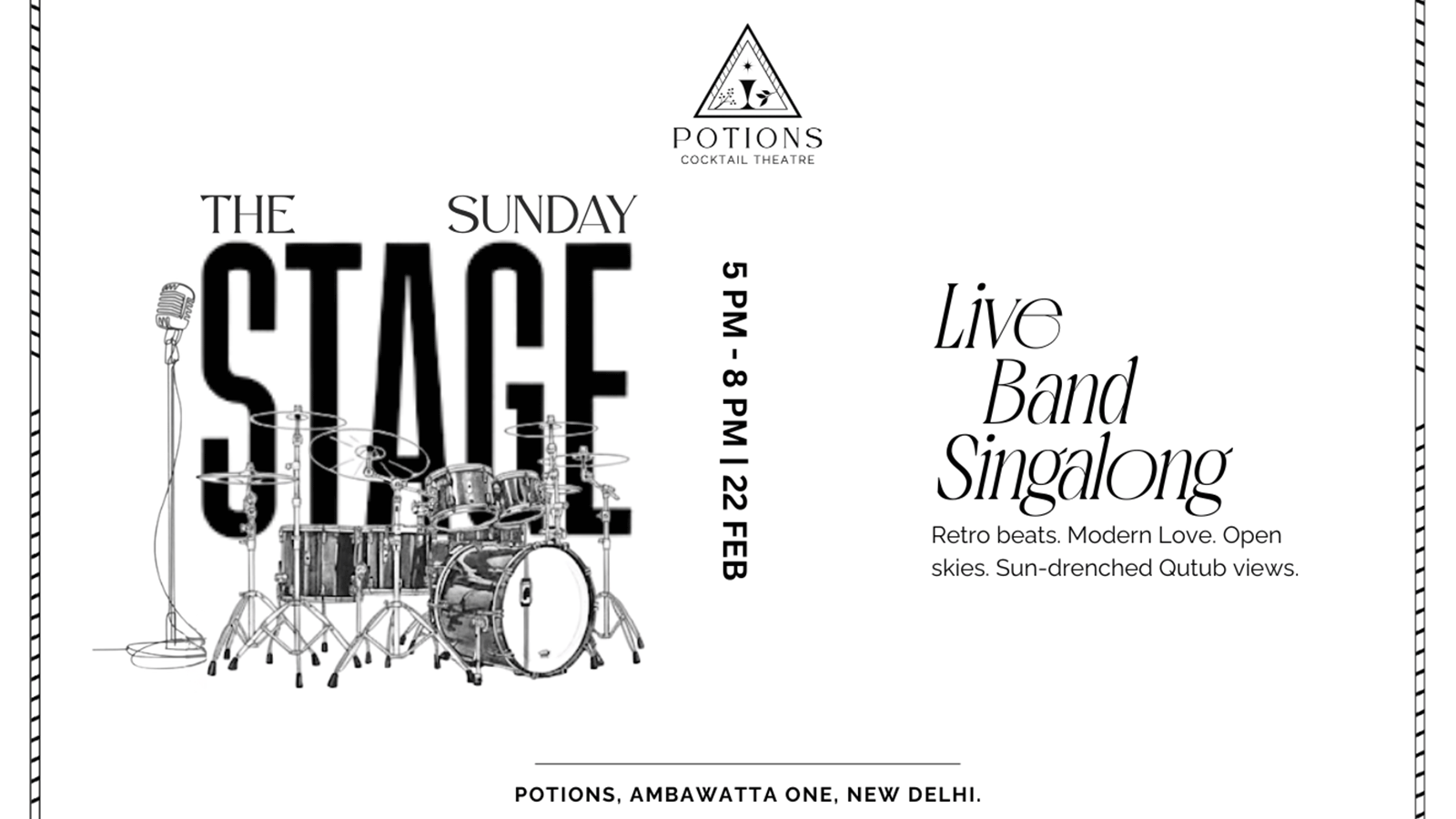 Set against sun-drenched views of the Qutub Minar, The Sunday Stage brings together high-energy live band performances, feel-good retro beats, and Potions’ signature cocktail theatre experience. It’s a relaxed yet vibrant rooftop affair—perfect for long conversations, unhurried cocktails, and music that carries you through the afternoon.