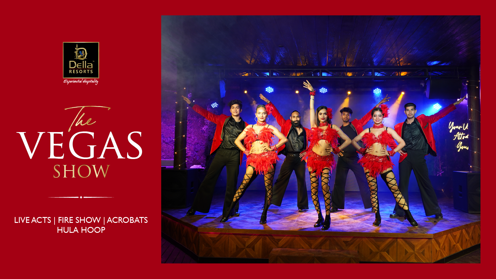 Step into a world of grandeur with The Vegas Show at Della Resorts. India's most electrifying poolside dinner show ,Immerse yourself in the pinnacle of luxury entertainment at Della Resorts, where a dazzling Vegas-inspired production unfolds amid our architecturally stunning restaurant venues. Witness gravity-defying aerial acrobats and dynamic hula hoop fire artists igniting the night, complemented by mesmerizing dancers including sultry belly dancers, rhythmic fire dancers, mime artists, and stilt walkers—all choreographed to perfection for an unforgettable symphony of motion and fire.