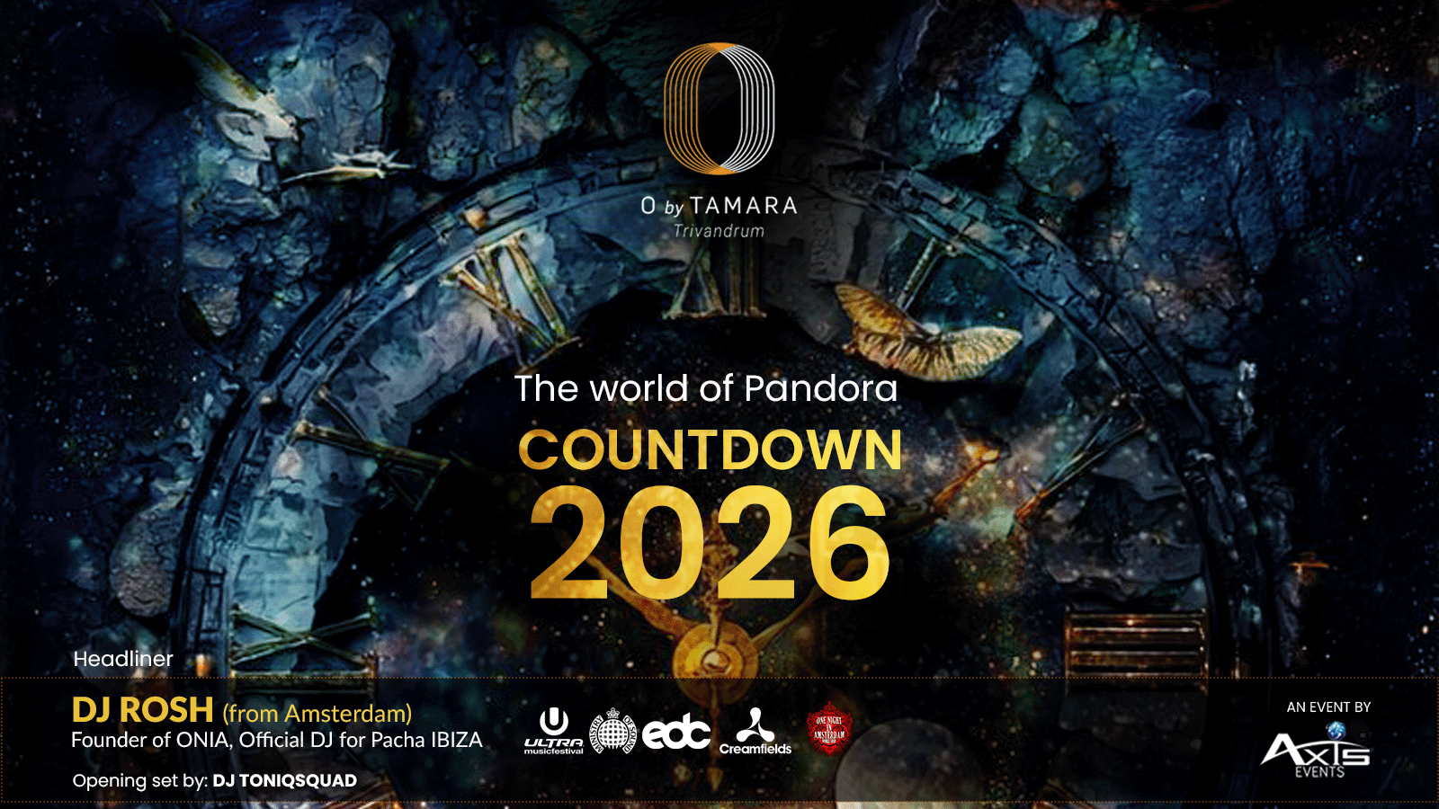 A visual marvel is all set to take over the NYE in Trivandrum at the most premium venue O by Tamara, right in the heart of the city THE WORLD OF PANDORA COUNTDOWN 2026 will have the colossal lineup it deserves. Announced artists are international superstar DJ ROSH from Amsterdam who is an official PACHA IBIZA Resident ,he has performed in TOMORROWLAND ,ULTRA MUSIC FESTIVAL, as well as TOP CLUBS LIKE USHUAIA IBIZA... ROSH has been playing at some of the world’s major festivals like Amsterdam Dance Event, The Flying Dutch, Future Music Festival, ULTRA Europe and It’s the SHIP and have shared shared stages with heavyweights Martin Garrix, Armin van Buuren, Marshmello, Pharrell Williams,Hardwell and The Chainsmokers to just name a few