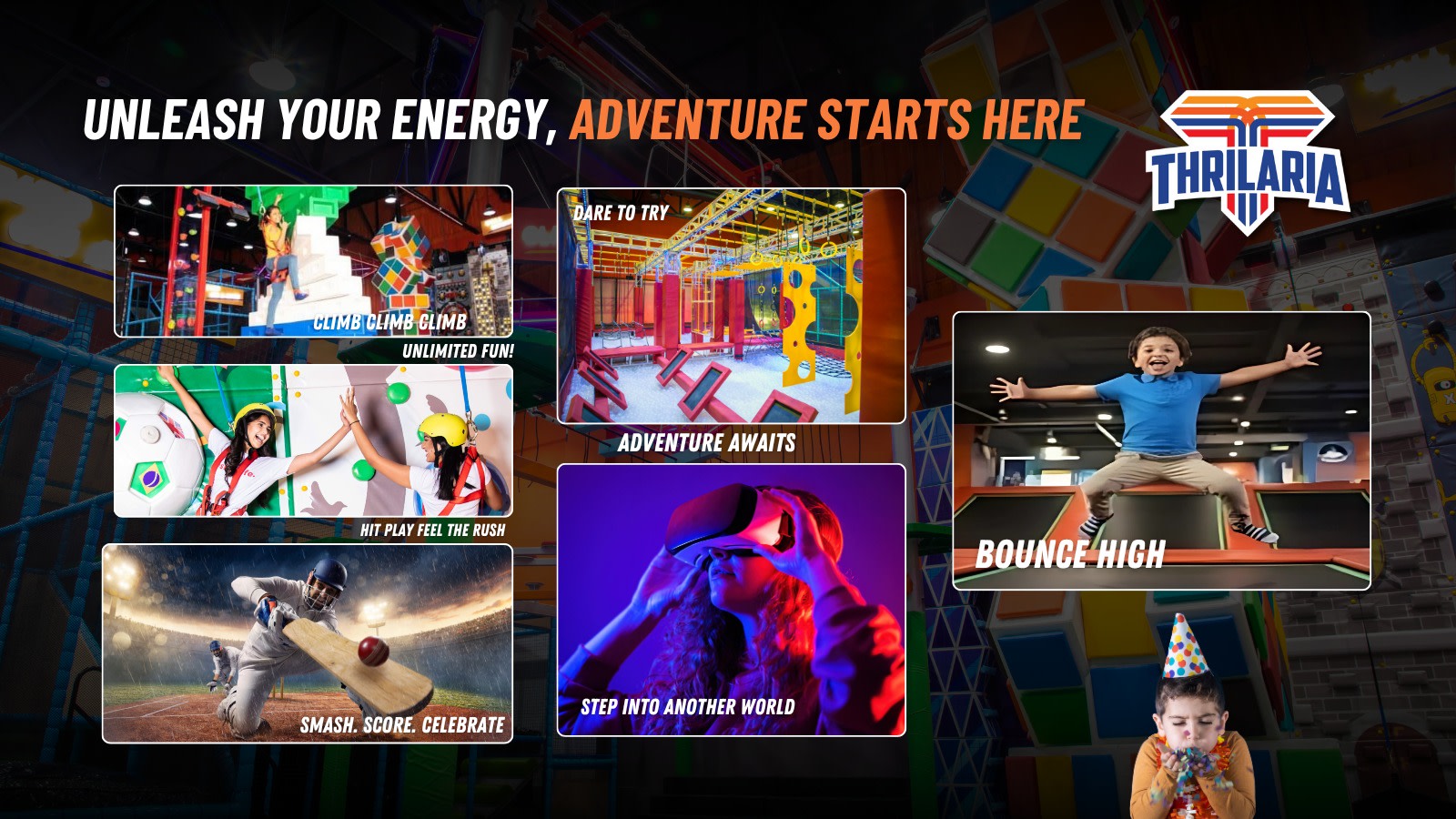 Head to Thrilaria at Sarath City Mall for an unforgettable day of action and adventure! Enjoy our climbing walls, trampoline zone, and conquer the challenging Ninja Warrior course. Bring your family and friends for a day packed with thrilling games, interactive challenges, and epic memories. Don't just play the game—live the adventure!