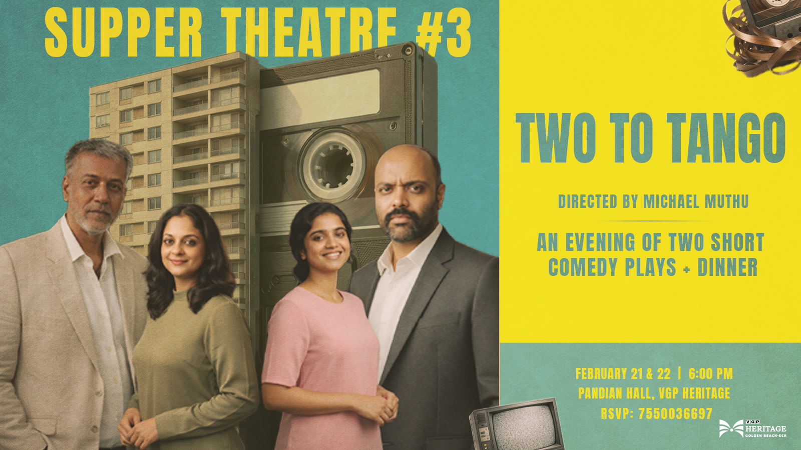 Staying true to our belief that experiences are best enjoyed when art, culture, and community come together, we are back with our 3rd edition of Supper Theatre, a unique concept of live theatre and a dining experience. After two successful editions, we are excited to present ‘Two to Tango’, 2 short back-to-back comedy plays directed by none other than theatre legend, Michael Muthu.