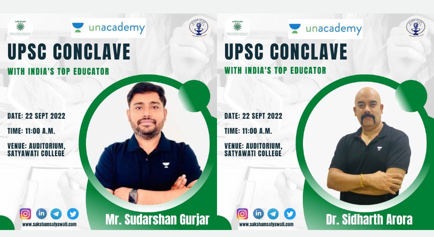 In collaboration with Unacademy, Saksham: Career Counselling, Placement and Entrepreneurship Cell of Satyawati College brings to you "UPSC CONCLAVE", a power-packed event with sessions and panel discussions with Top Educators of UPSC CSE and distinguished bureaucrats.