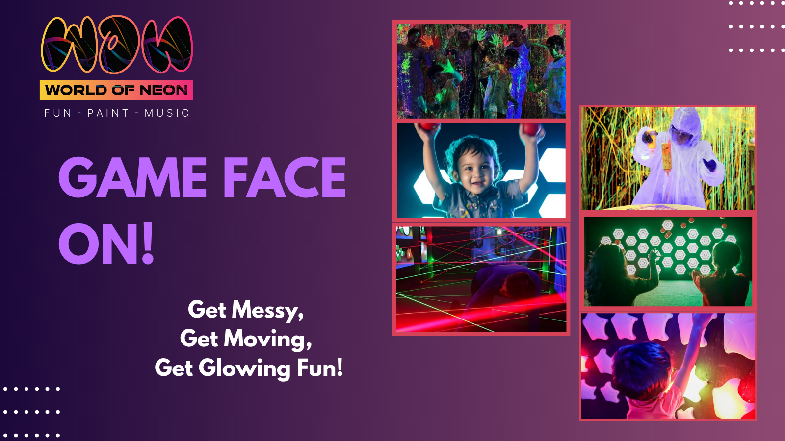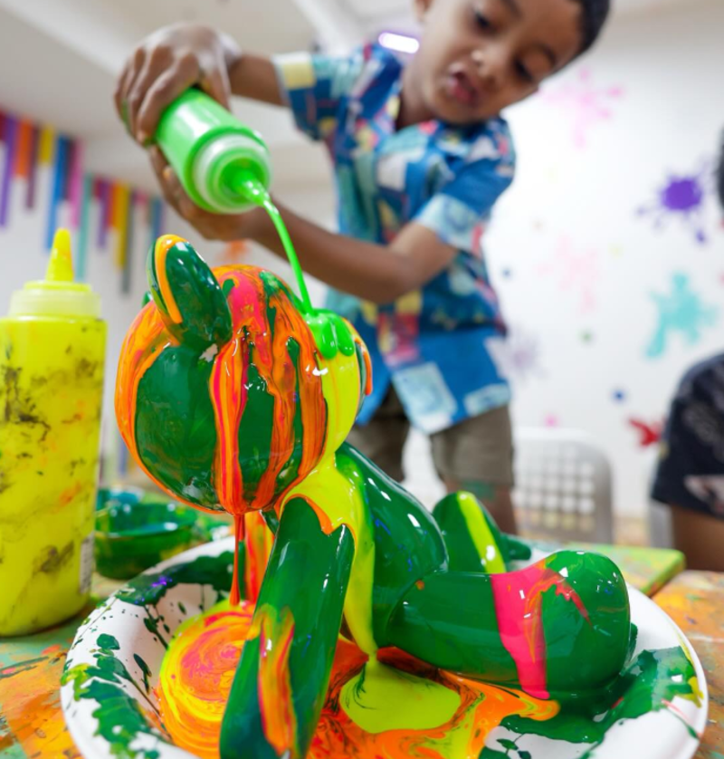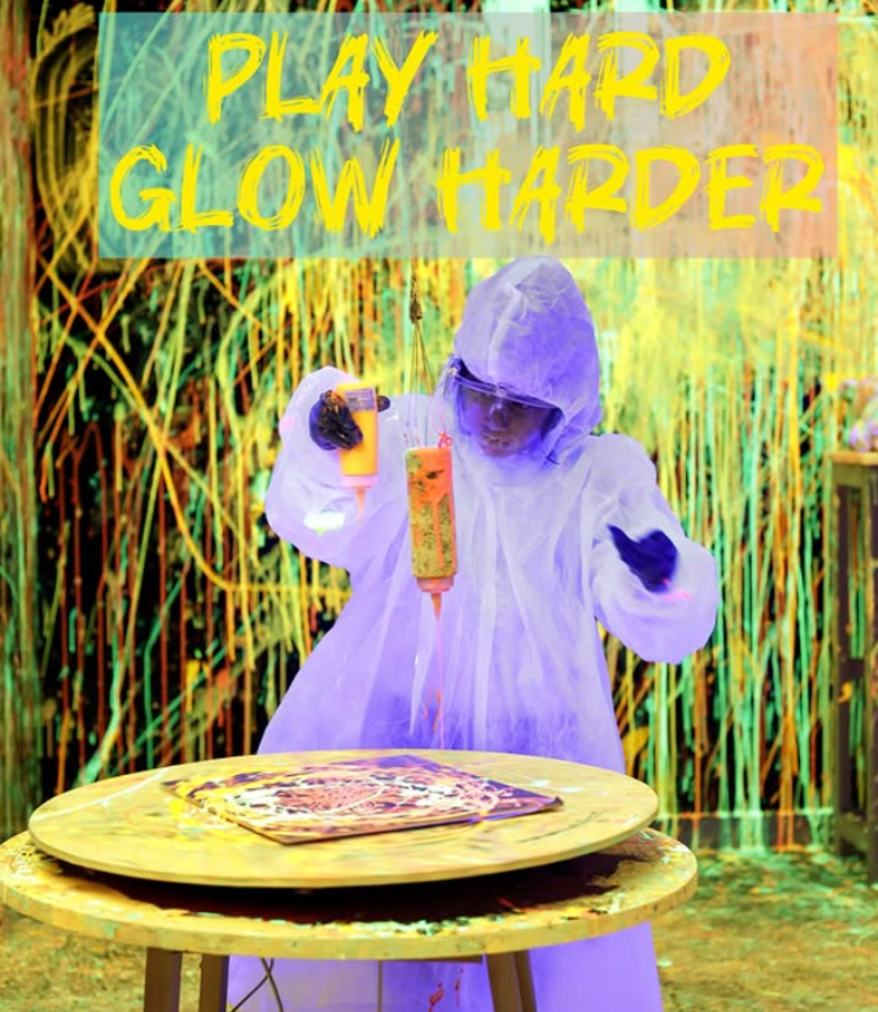 🎨 Neon Splatter Art Zone—Try pendulum painting, spin art, tie-dye, and more in UV-lit rooms