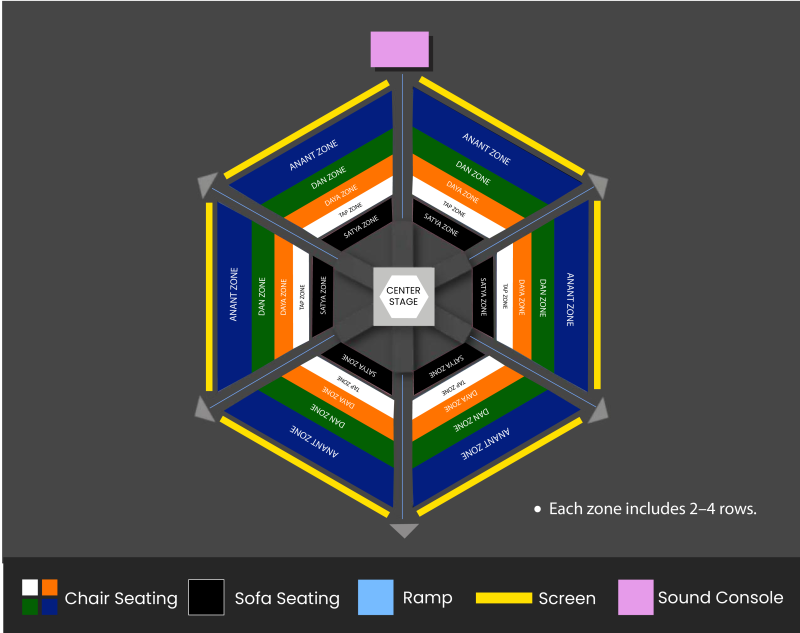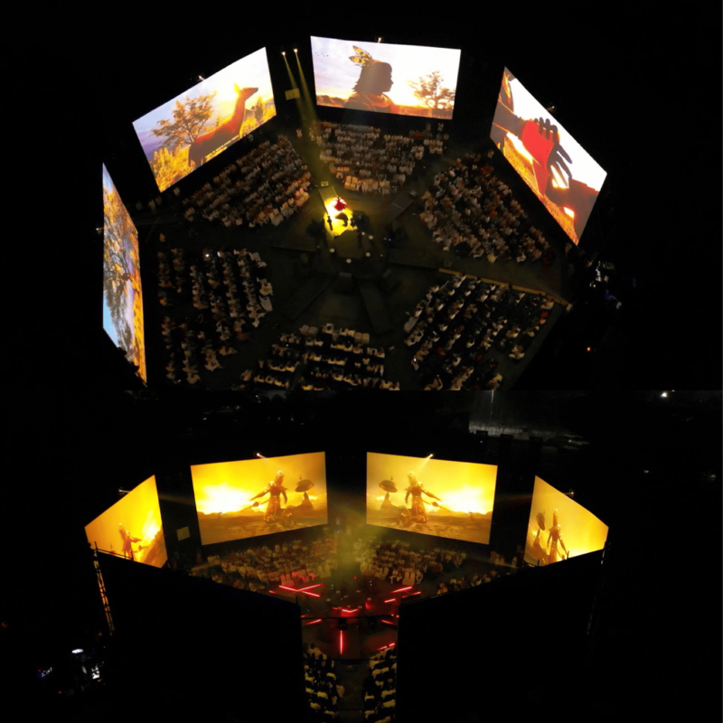 The six screens form a hexagon, with the audience seated at the center - creating a