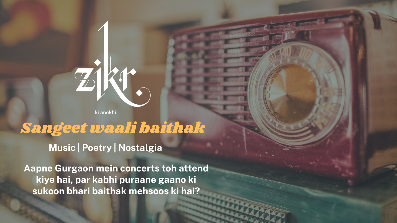 ZIKR is an intimate listening-led live music baithak of old Hindi songs, ghazals, and poetry. Mogre ke gajre ki khushboo, kullad waali chai aur aapke favourite puraane gaane.