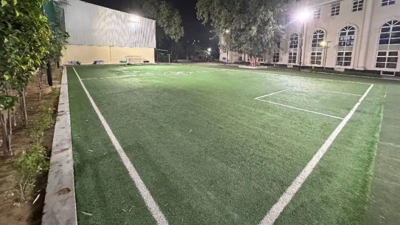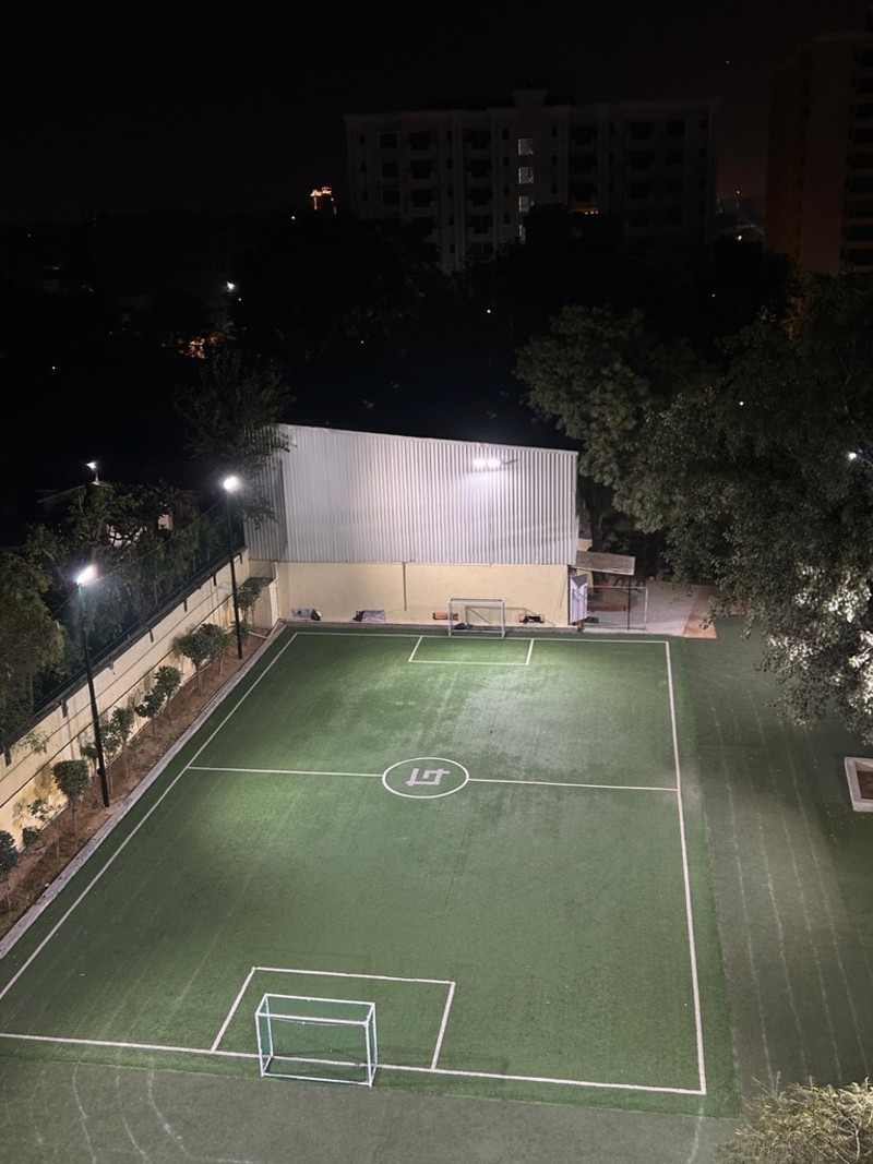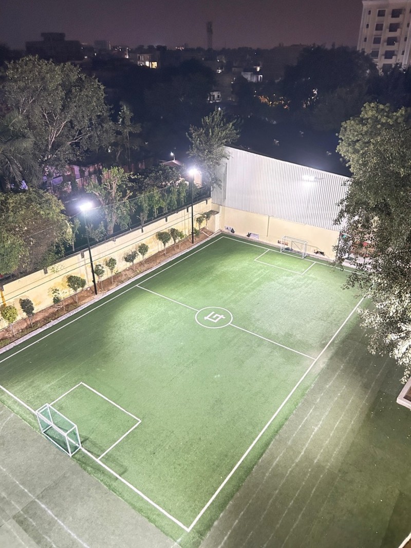 A proper sports hub inside Blue Angels Global School, Charmwood. Think clean turf, good lighting, and a setup that doesn’t feel like it was built overnight. They offer 6v6 football and box cricket. Suitable for beginners, try-hards, and that one friend who arrives late but still argues the most.