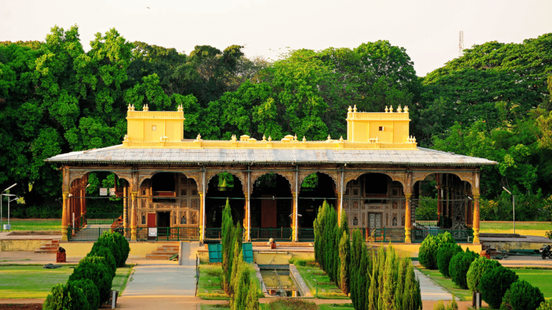 Commissioned by Tipu Sultan, the palace reflects his interest in art, architecture and landscape design. The complex once functioned as a residence and a place of leisure for the royal family. Its paintings depict battle scenes, including the victories of Haider Ali in 1780, as well as ornamental floral patterns that express the decorative traditions of Mysore.