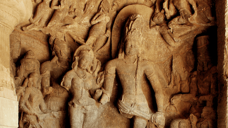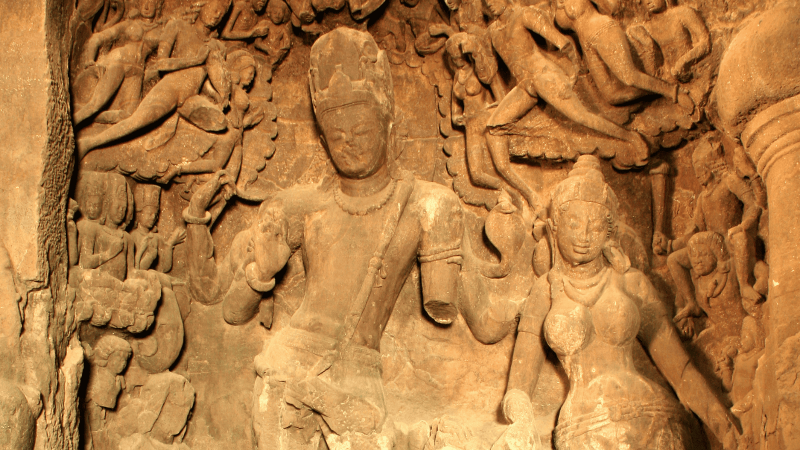 Carved from solid rock, Cave 1 features a central hall with six rows of massive pillared columns and entrances from the north, east and west. Its focal point is the seven metre high Trimurti image of Shiva, known as Maheshmurti, representing creation, preservation and destruction through Aghora or Bhairava, Taptapurusha or Mahadeva and Vamadeva or Uma. Eight sculpted panels depict aspects of Shiva, including Ardhanarishvara and scenes of Shiva and Parvati playing chausar.