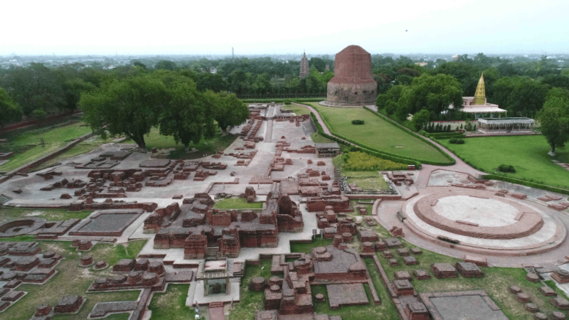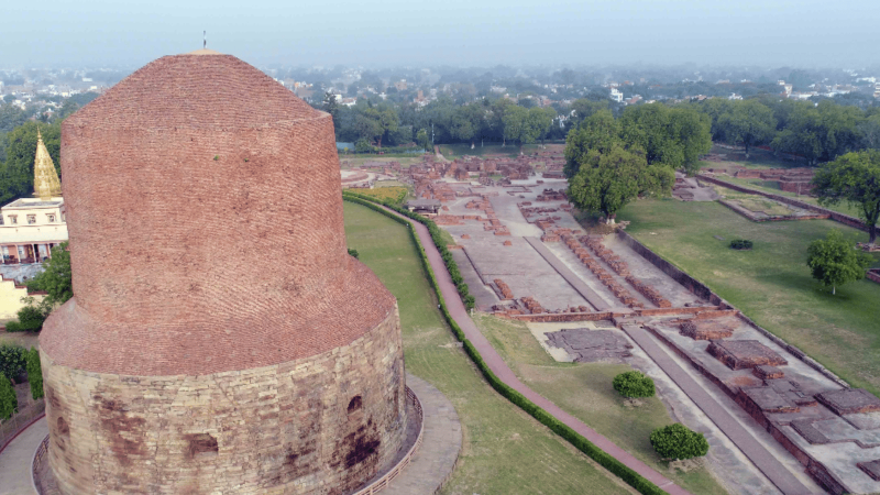 Findings at the site include the Dhamekh Stupa, the Dharmarajika Stupa, an apsidal chapel, the Ashokan pillar, a Panchayatan temple, monolithic railings, numerous votive stupas, sculptures, inscriptions and architectural fragments ranging from the 3rd century B.C.E. to the 12th century C.E. Dhamekh Stupa is especially important as it marks the place where the Buddha delivered his first discourse to his five disciples. The Dharmarajika Stupa and the Ashokan pillar were constructed under the patronage of King Asoka to disseminate Buddhist teachings.