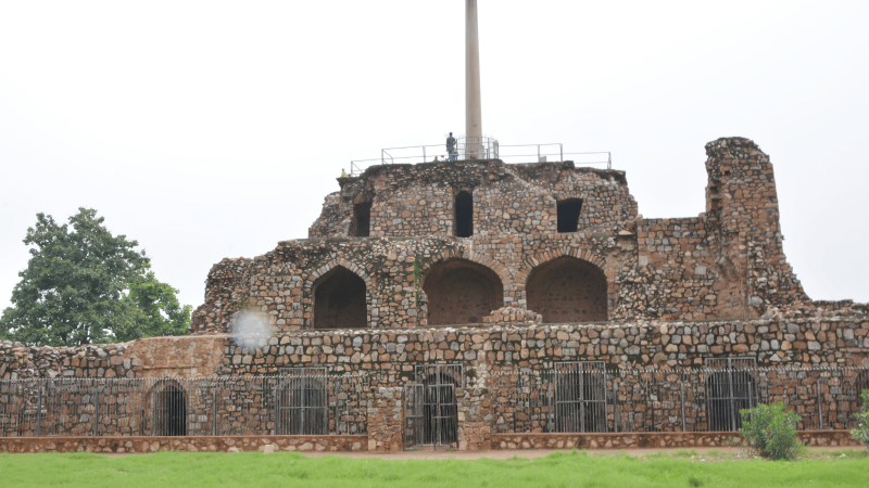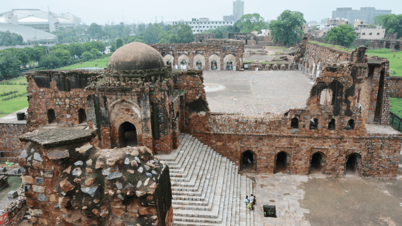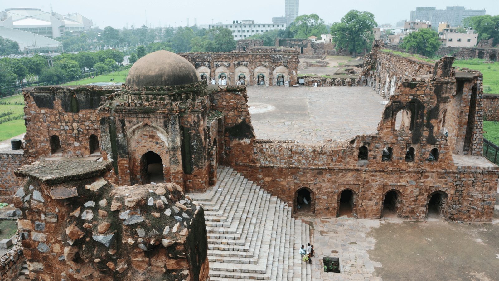 The complex includes a well-preserved baoli with stepped construction, mosque structures and the monumental Ashoka Pillar framed within the fortress landscape. The fort’s masonry, open courtyards and layered remains highlight the architectural transitions of the fourteenth century.